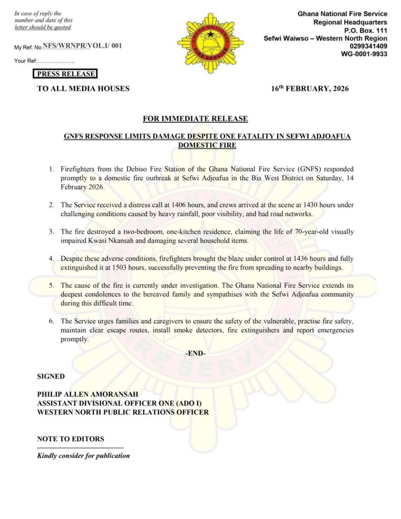 According to a statement released by the GNFS, Firefighters from the Debiso Fire Station responded to a distress call received at 1406 hours on Saturday, 14 February 2026, reporting a domestic fire at Sefwi Adjoafua in the Bia West District.