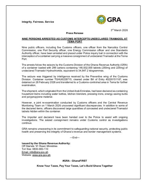 The GRA added that it remains committed to safeguarding national security, protecting public health and preserving the integrity of Ghana’s revenue and border management systems.