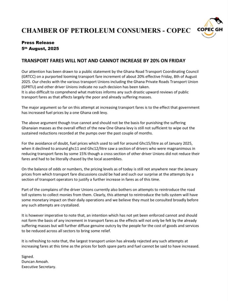 The Chamber of Petroleum Consumers (COPEC) has dismissed reports of an impending 20% increase in public transport fares scheduled to take effect Friday, August 8, 2025.