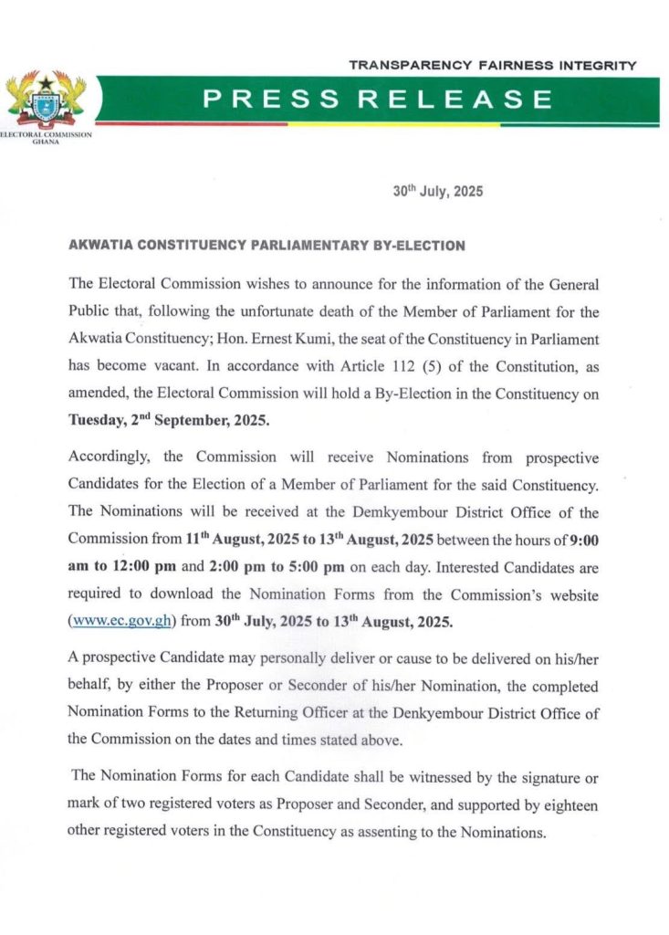 The Electoral Commission (EC) has officially announced Tuesday, September 2, 2025, as the date for the by-election in the Akwatia Constituency following the passing of its Member of Parliament, Hon. Ernest Kumi.