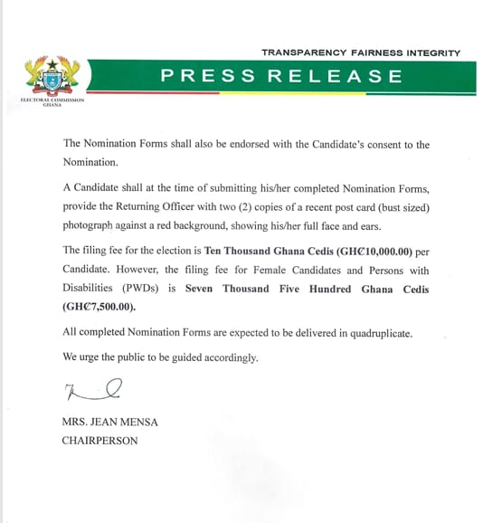 Candidates are required to submit two recent passport-sized photographs and pay a filing fee of GHC10,000. However, female candidates and persons with disabilities (PWDs) will pay a reduced fee of GHC7,500.