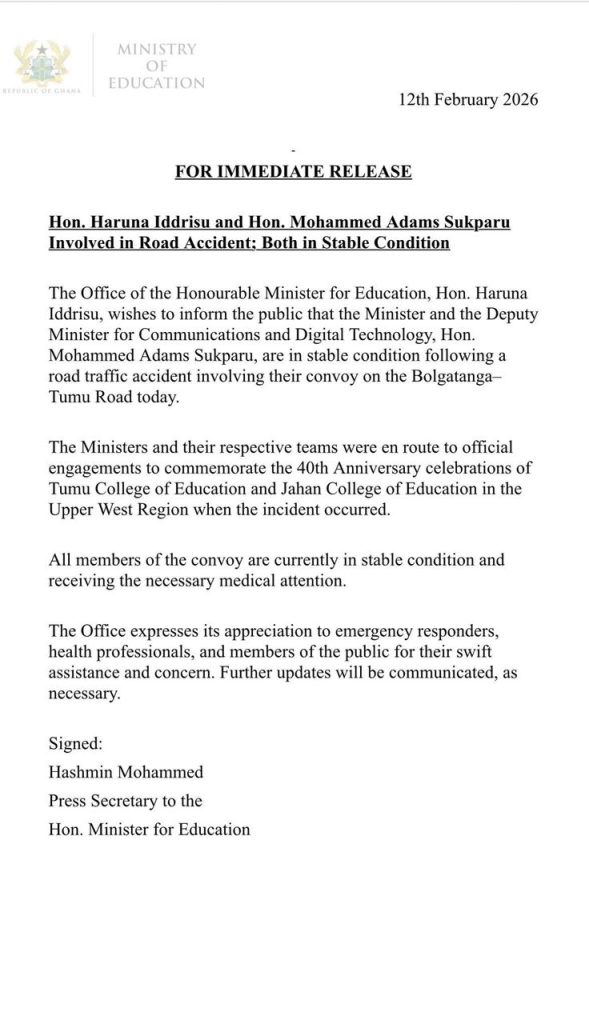Th office of the Minister for Education has confirmed that Haruna Iddrisu and the Deputy Minister for Communication, Digital Technology and Innovation Mohammed Adams Sukparu are in a stable condition following a road traffic accident on Thursday February 12, 2026. The incident involved their convoy on the Bolgatanga–Tumu Road while the Ministers and their respective teams were traveling to the Upper West Region.
