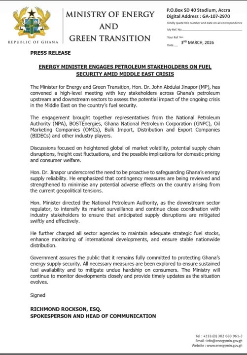 Government has initiated high-level consultations across Ghana’s petroleum value chain to assess the potential impact of the ongoing Middle East crisis on domestic fuel security and price stability.