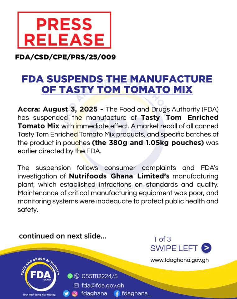 The Food and Drugs Authority (FDA) has announced the immediate suspension of the manufacture of Tasty Tom Enriched Tomato Mix, following serious health and safety concerns uncovered during recent investigations.