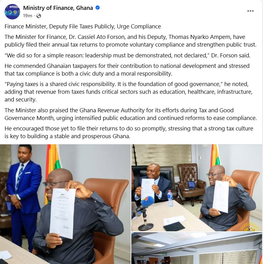In a move aimed at boosting public confidence in the tax system, Ghana’s Finance Minister, Cassiel Ato Forson, and his Deputy, Thomas Nyarko Ampem, have openly filed their annual tax returns, positioning themselves at the forefront of a campaign to encourage voluntary compliance.