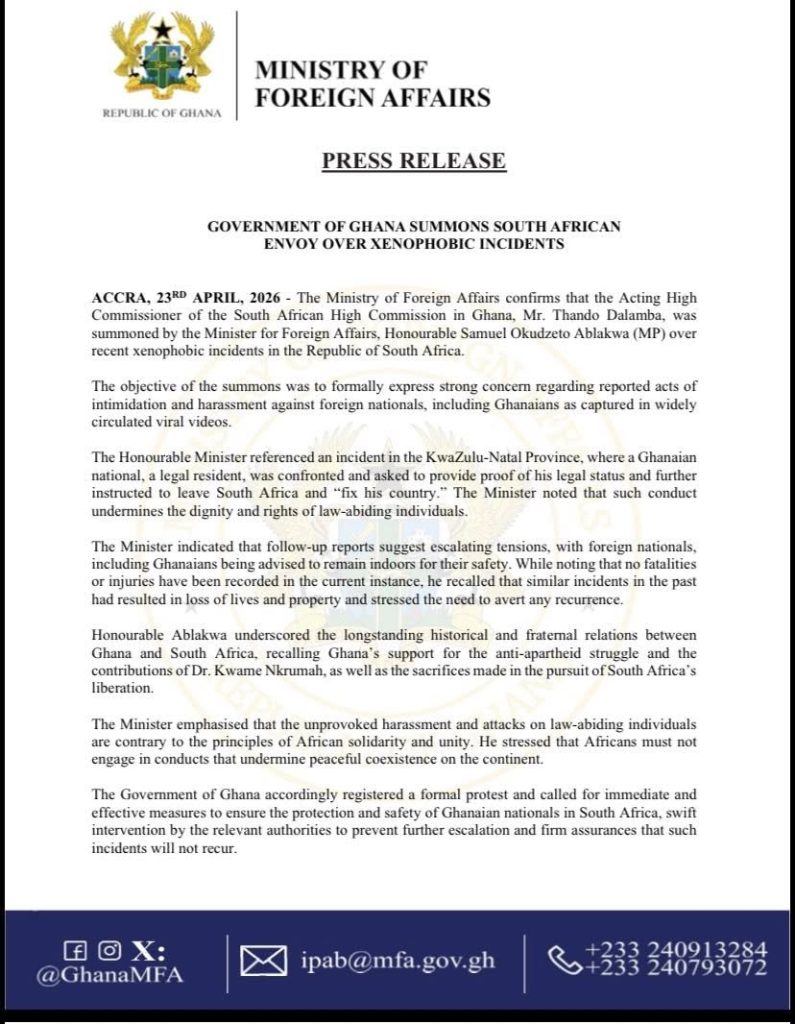 The Ministry of Foreign Affairs has formally summoned the Acting High Commissioner of South Africa to Ghana, Mr. Thando Dalamba, following renewed concerns over reported xenophobic incidents targeting Ghanaian nationals in South Africa.