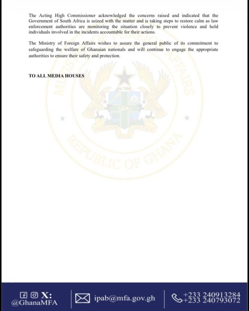 Although no fatalities or major injuries have been recorded in the latest reported incidents, the Ministry of Foreign Affairs reiterated its firm commitment to ensuring the safety and welfare of Ghanaian nationals residing in South Africa.