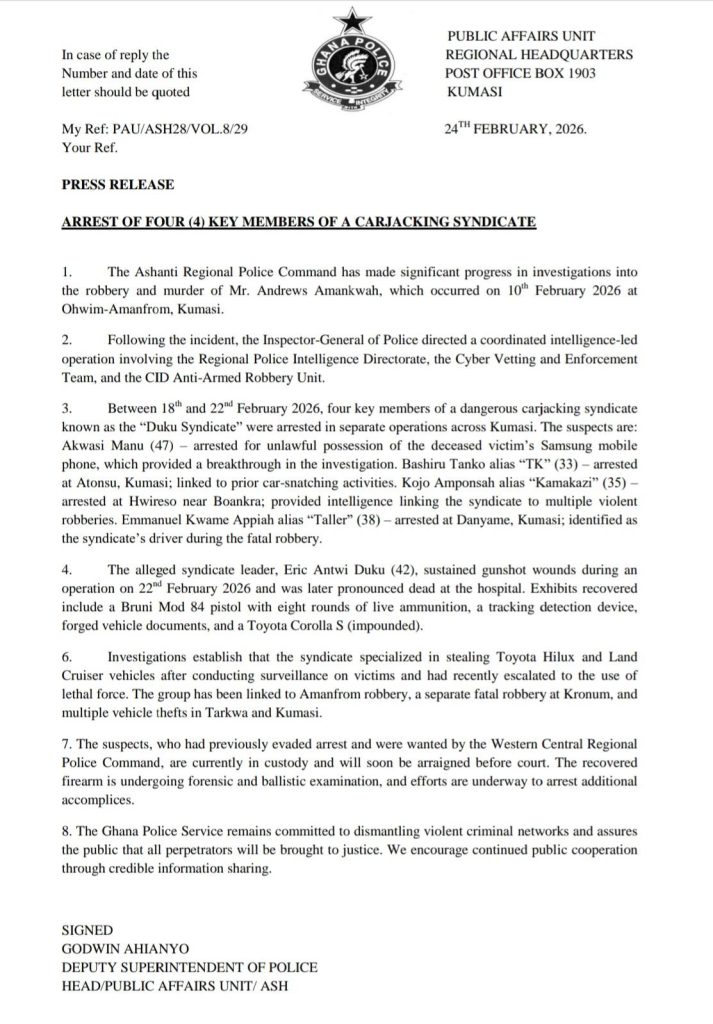 The Ghana Police Service has arrested four suspected members of a notorious carjacking syndicate operating in Kumasi and other parts of the country, following investigations into the robbery and killing of Mr. Andrews Amankwah.