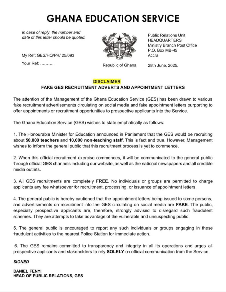 The Ghana Education Service (GES) has cautioned the general public against fraudulent recruitment advertisements and fake appointment letters circulating on social media, which falsely claim to offer employment opportunities within the Service.