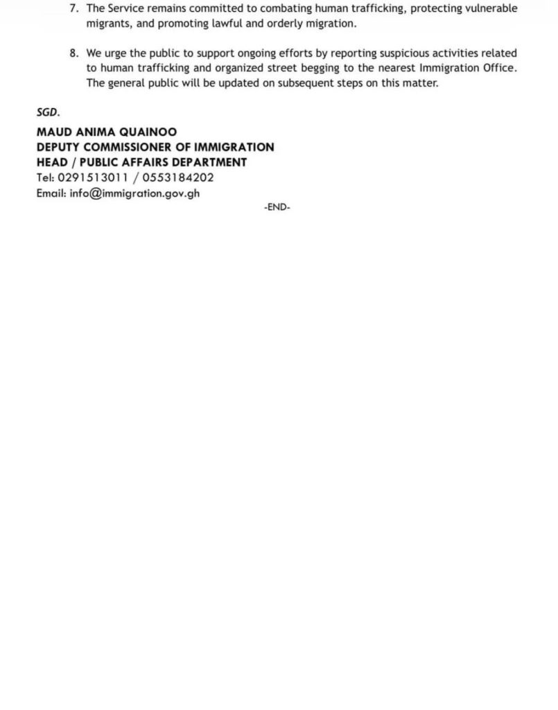 The Ghana Immigration Service reaffirmed its commitment to combating human trafficking, protecting vulnerable migrants and promoting lawful and orderly migration. It is urging the public to report suspicious activities linked to human trafficking or organised street begging to the nearest Immigration Office, promising to update citizens on further actions in the coming days.
