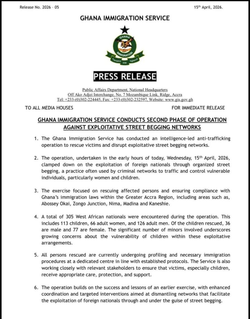 The Ghana Immigration Service has carried out a second major anti-trafficking operation targeting criminal networks behind exploitative street begging in the Greater Accra Region. The intelligence-led exercise, conducted in the early hours of Wednesday, 15 April 2026, focused on rescuing foreign nationals and enforcing immigration laws in areas including Abossey Okai, Zongo Junction, Nima, Madina, and Kaneshie.