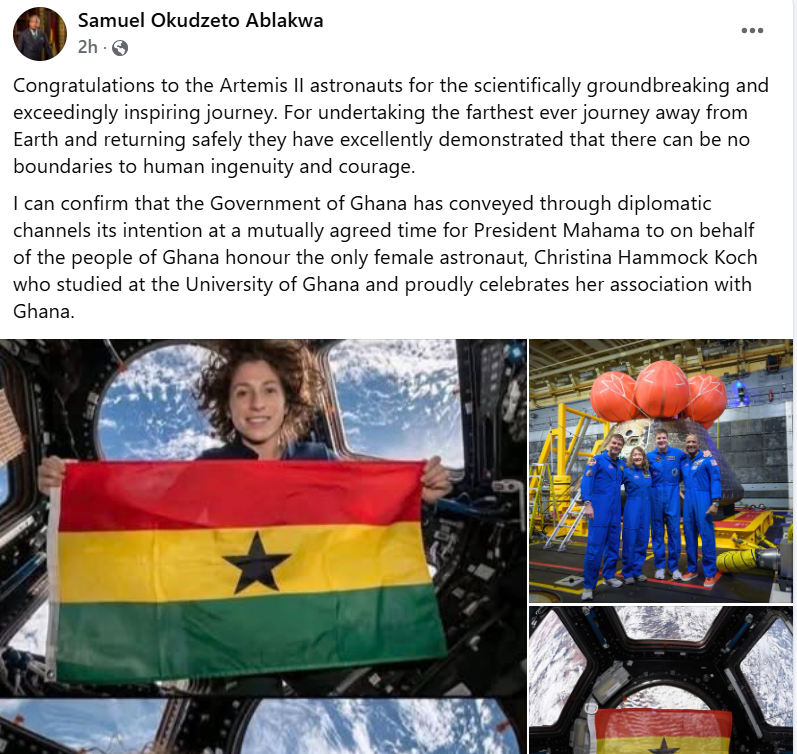 In a Facebook post on Sunday, April 12, the Minister for Foreign Affairs, Samuel Okudzeto Ablakwa, congratulated the Artemis II crew for what he described as a scientifically groundbreaking and inspiring mission.