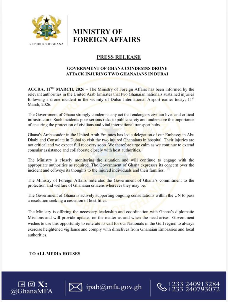 In a press release issued in Accra on March 11, 2026, the Ministry stated that it had been informed by relevant authorities in the UAE that the two Ghanaians sustained injuries during the incident earlier that day.
