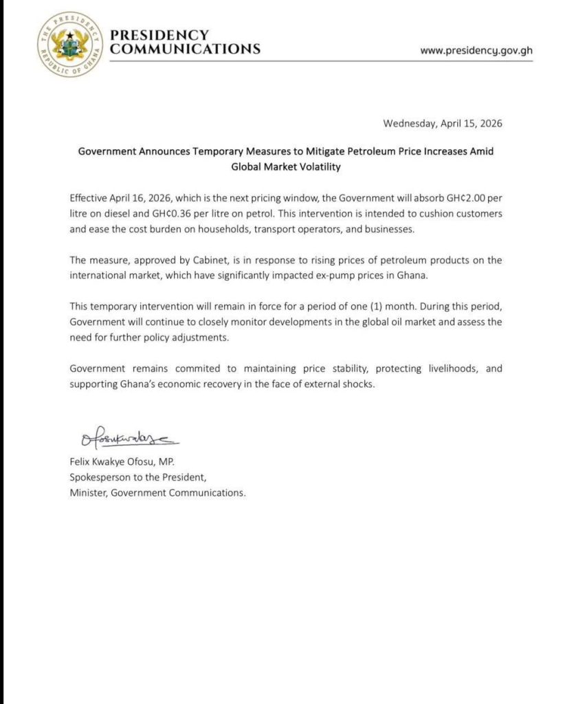 The Presidency has announced temporary relief measures to reduce the impact of rising global oil prices on Ghanaian consumers, effective April 16, 2026.
