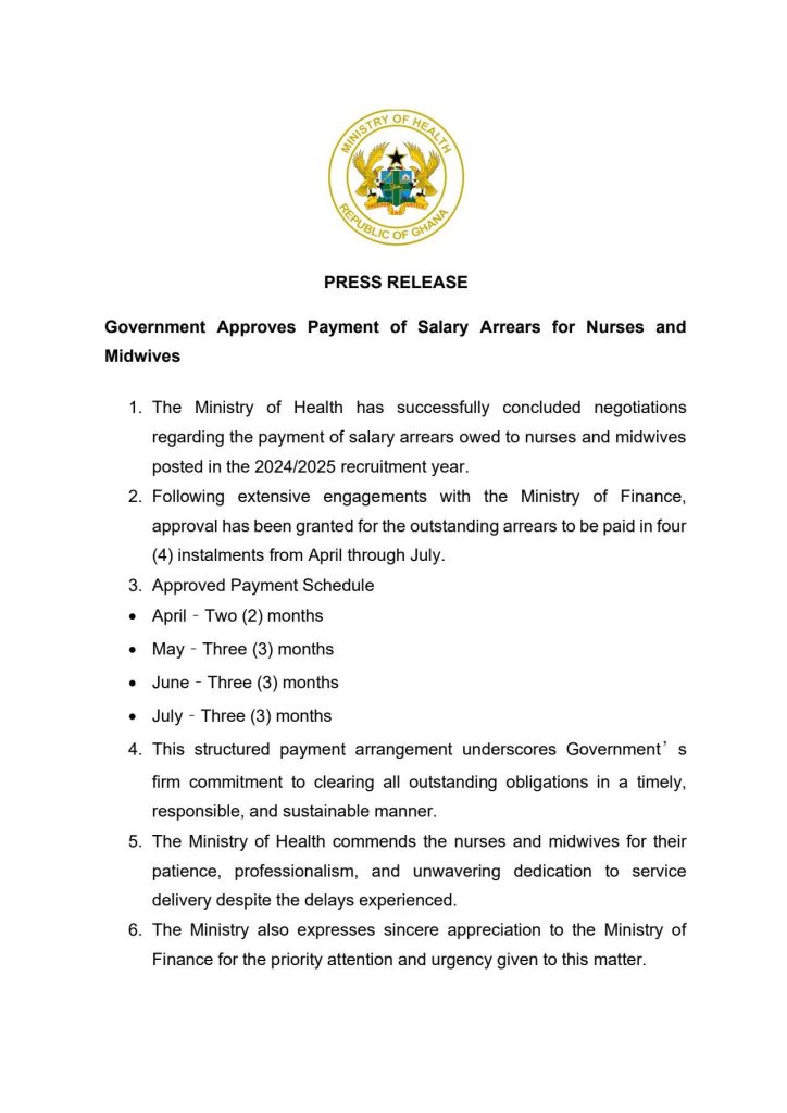 The Ministry of Health has confirmed that salary arrears owed to nurses and midwives posted in 2024/2025 will be paid following successful negotiations with the Ministry of Finance.