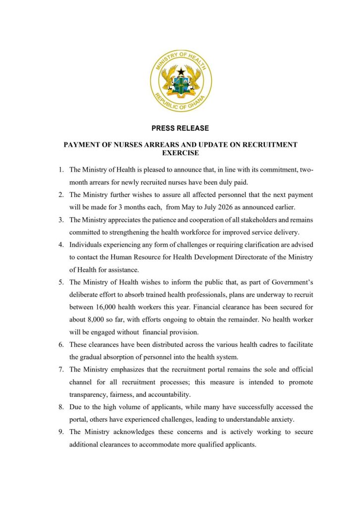 In a press release, the Ministry indicated that the next phase of payments will cover three months of arrears each from May to July 2026, in line with an approved staggered settlement plan. It commended affected nurses and other health personnel for their patience and cooperation, stressing its commitment to strengthening the health workforce to improve service delivery nationwide.
