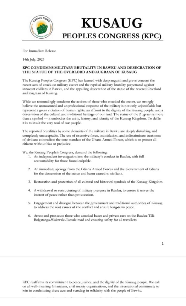 The Kusaug People’s Congress (KPC) has issued a strongly worded statement condemning recent acts of military brutality against civilians in Bawku and what it describes as the “appalling desecration” of the statue of the Zugraan, the Overlord of the Kusaug Kingdom.
