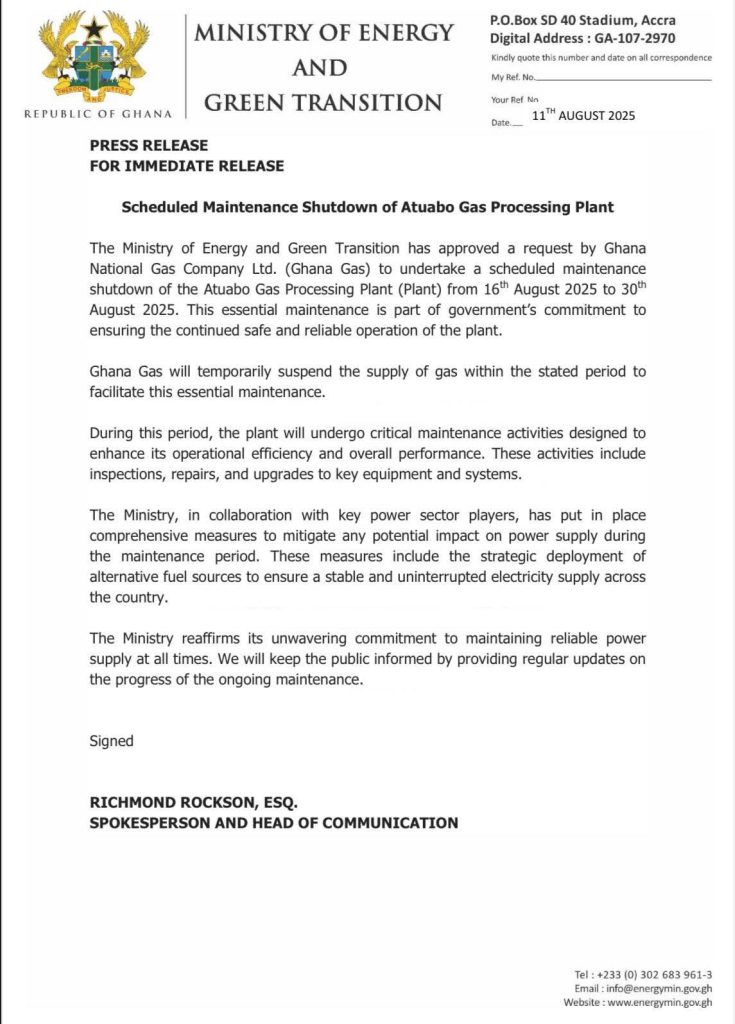 The Ministry of Energy and Green Transition has granted approval to Ghana National Gas Company Ltd. (Ghana Gas) to carry out a scheduled maintenance shutdown of the Atuabo Gas Processing Plant from August 16 to August 30, 2025.