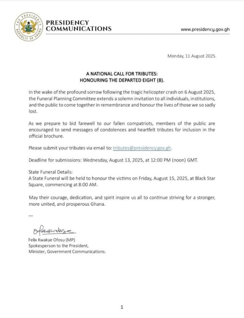 Tributes should be sent via email to tributes@presidency.gov.gh no later than Wednesday, August 13, 2025, at 12:00 noon GMT.