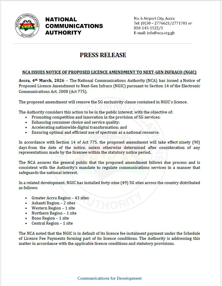 The National Communications Authority (NCA) has issued a Notice of Proposed Licence Amendment to Next-Gen Infraco (NGIC) under Section 14 of the Electronic Communications Act, 2008 (Act 775).