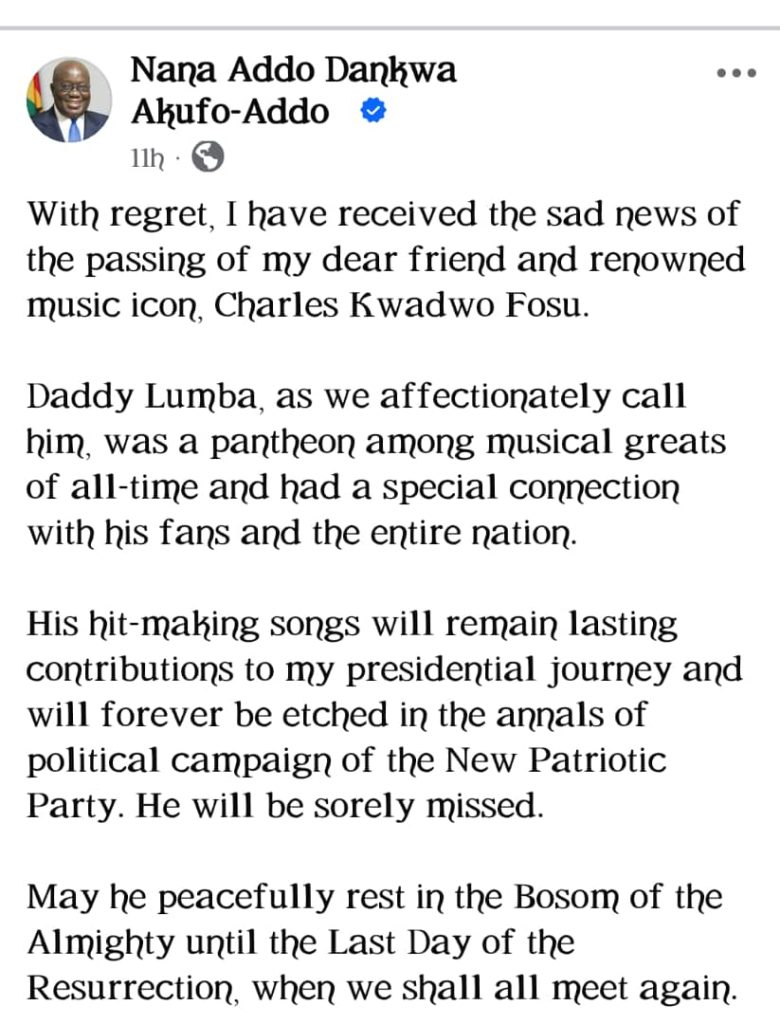 “With regret, I have received the sad news of the passing of my dear friend and renowned music icon, Charles Kwadwo Fosu. Daddy Lumba, as we affectionately call him, was a true legend,” Akufo-Addo said.