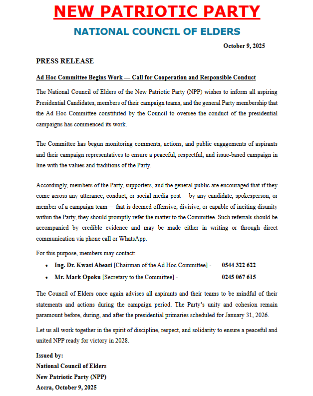 In a statement dated October 9, 2025, the Council announced that an Ad Hoc Committee constituted to oversee the conduct of the presidential campaigns has officially commenced its work. The committee is tasked with monitoring the comments, actions, and public engagements of aspirants and their representatives to ensure a peaceful, respectful, and issue-based campaign that reflects the values and traditions of the party.