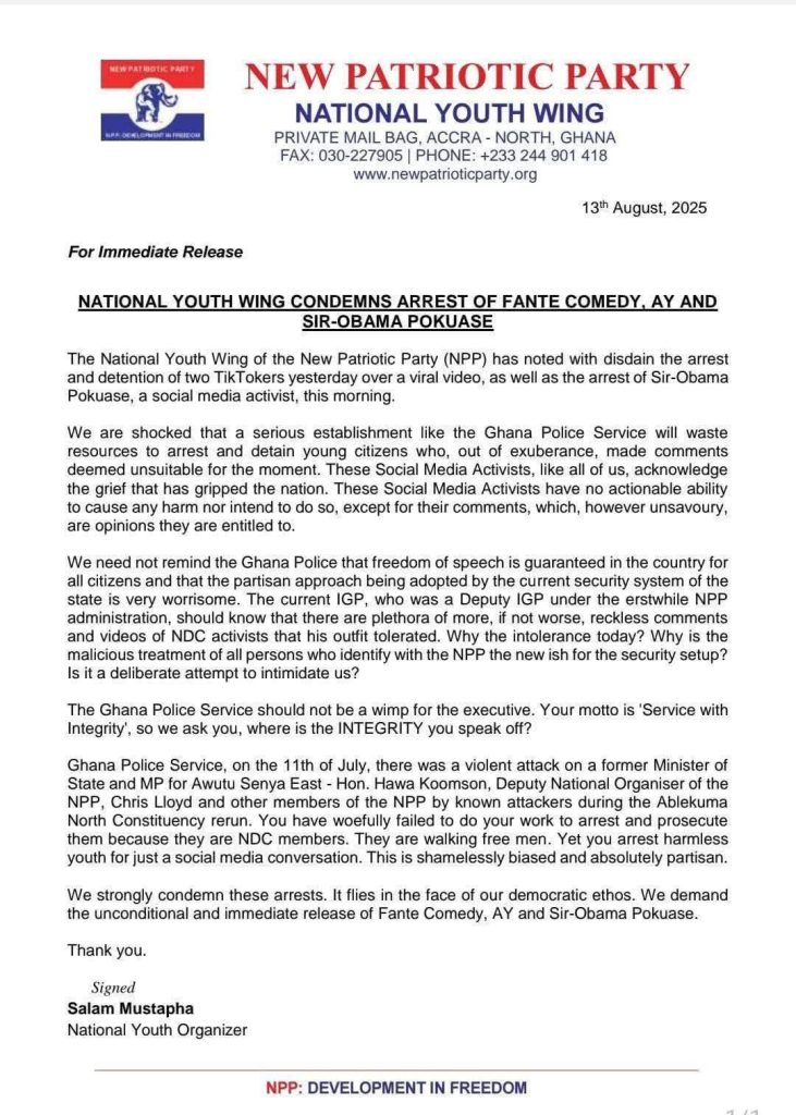 The National Youth Wing of the New Patriotic Party (NPP) has criticised the arrest and detention of two TikTok personalities, including Fante Comedy and AY, as well as social media activist Sir-Obama Pokuase, describing the move as a waste of police resources and an attack on free speech.