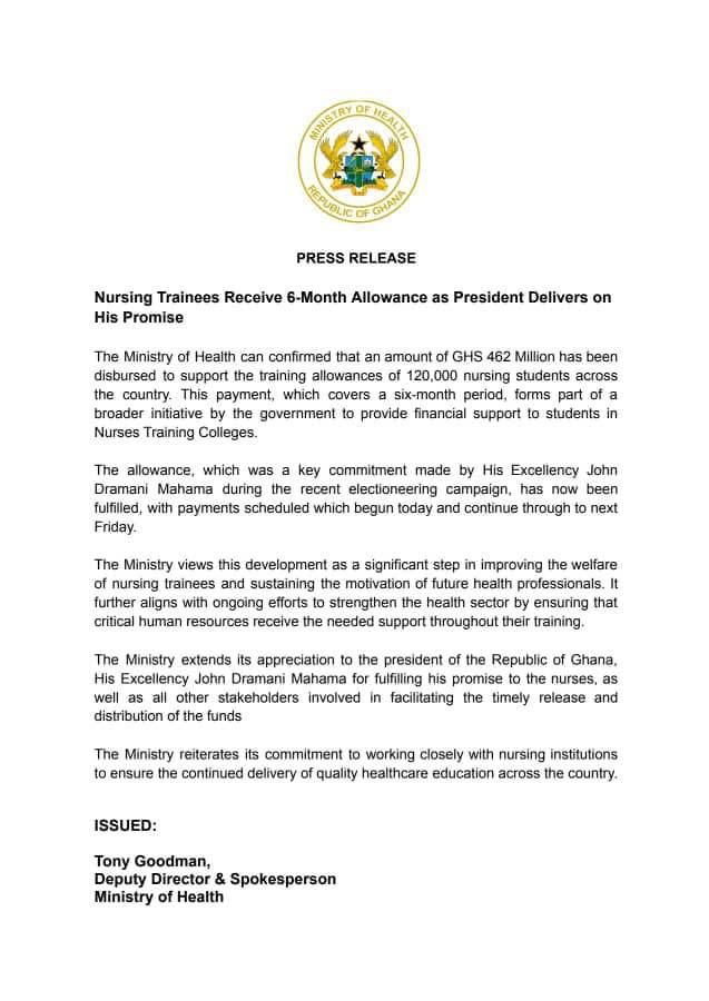 Nursing trainees are receiving a six-month allowance as President John Dramani Mahama fulfills a campaign promise. Specifically, the Ministry of Health has confirmed the disbursement of GHC 462 million to support training allowances for 120,000 nursing students nationwide.