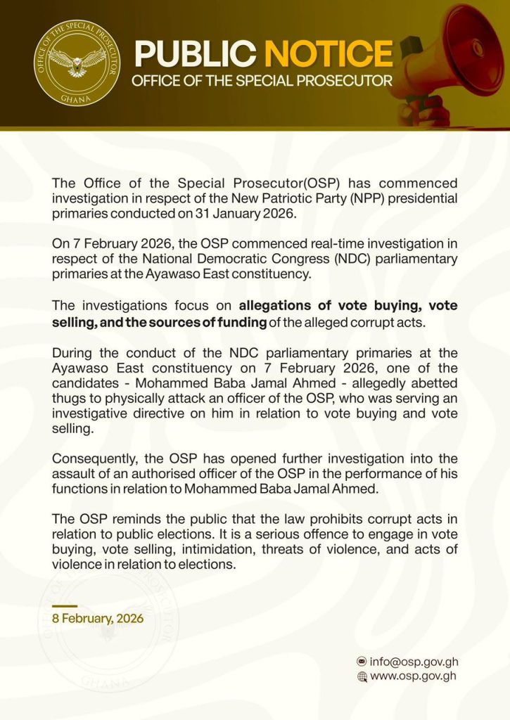 In a public notice dated February 8, 2026, the OSP announced that it has opened investigations into the NPP presidential primaries held on January 31, 2026. The investigations are examining allegations of vote buying, vote selling, and the sources of funds used to finance the alleged corrupt practices.