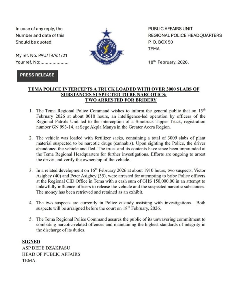 According to a press release issued by the Tema Regional Police Command on February 18, the operation took place in the early hours of February 15, 2026.