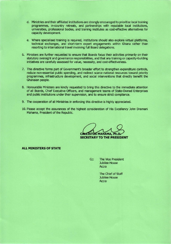 The directive also strongly encourages ministries and their affiliated institutions to prioritise local training programmes, in-country retreats, and partnerships with reputable local institutions, universities and professional bodies as cost-effective alternatives for capacity development. Where specialised expertise is required, institutions have been advised to explore virtual platforms, technical exchanges, and short-term expert engagements within Ghana rather than resorting to international travel involving full board delegations.