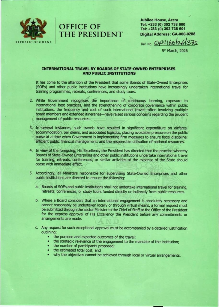 The directive, issued from the Jubilee House on March 5 and signed by Secretary to the President Callistus Mahama, follows what the presidency described as a troubling pattern of overseas travel by board members that had placed significant strain on the public purse. The instruction applies to all state-owned enterprises and public institutions, bringing an abrupt halt to a practice the government said had grown both in frequency and expense.