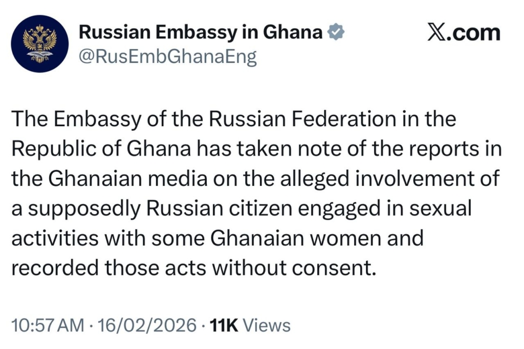 In a statement posted on X (formerly Twitter) on Monday, February 16, 2026, the Embassy said the reports circulating in the Ghanaian media relate to claims that a man believed to be Russian engaged in sexual relations with Ghanaian women and recorded the acts without their knowledge or approval.