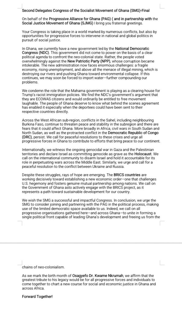 The speech concluded with a strong call for unity, urging the SMG to partner with the PAG and other progressive organisations to form a single political front capable of leading Ghana’s development and breaking free from neo-colonial control. Delegates were reminded that the greatest tribute to Nkrumah’s legacy is for progressive forces to come together to chart a new course for social and economic justice in Ghana and across Africa.